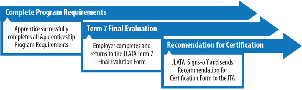 The Recommendation for Certification form is signed-off by the Chairman of the Board, the individual holding credentials eligible for sign-off authority.  By completing this form, the JLATA is attesting that the Apprentice is now working at the skill level of a certified journeyman.